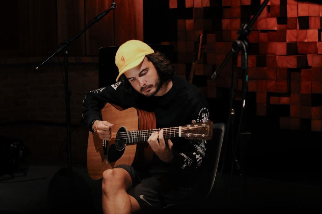 Simão: Gravar sempre é massa, um experiência que o cara sempre se põe a pensar no que vai fazer de diferente do que já fez e a galera vai gostar. Isso é muito legal, de tentar descobrir o que fazer. Dá combustível pro músico. Lancei a primeira música em Maio e as outras vieram numa sequência durante a pandemia. Então a gente não tinha muita resposta do público no show, algo assim; a gente tinha e tem só feedback da internet. Como a gente tava no meio da pandemia e lançando só trabalhos novos, meio que sente uma necessidade de dar mais um gás nessas músicas que lancei e veio a ideia. ‘Será que faço um acústico? Com as mesmas músicas vai ficar igual?’. E aí pensei, ‘vamos fazer um arranjo diferente no formato tipo acústico que visualmente vai parecer acústico’. Mas como tem o contrabaixo e guitarra não é um acústico. Assim surgiu a ideia. Conheci dois produtores muito legais de Curitiba e a gente foi lá e gravou. A gente ensaiou num dia pra gravar no outro e saiu com um resultado fantástico. Toda vez que vejo o clipe eu falo ‘pô velho, é isso que eu queria’. Ficou muito legal.