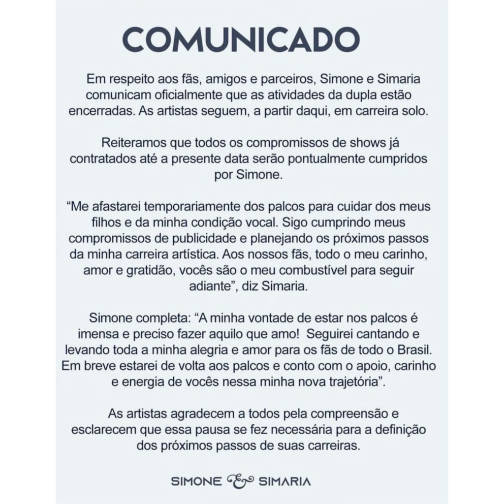 Segundo trecho do comunicado, “Em respeito aos fãs, amigos e parceiros, Simone e Simaria comunicam oficialmente que as atividades da dupla estão encerradas. As artistas seguem, a partir daqui, em carreira solo. Reiteramos que todos os compromissos de shows já contratados até a presente data serão pontualmente cumpridos por Simone”.