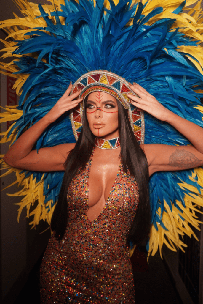 Para a ocasião, Carla escolheu um lindo e elegante vestido com decote em “V” e costas abertas, todo trabalhado em cristais Swarovski de diversas cores, uma criação deslumbrante do estilista Rodrigo Andrett. Complementando o visual, usou um cocar com penas artificiais em tons de marrom, azul e amarelo, que remete à cultura indígena. A maquiagem impecável foi assinada por Renato Mendes, que destacou ainda mais sua beleza.
