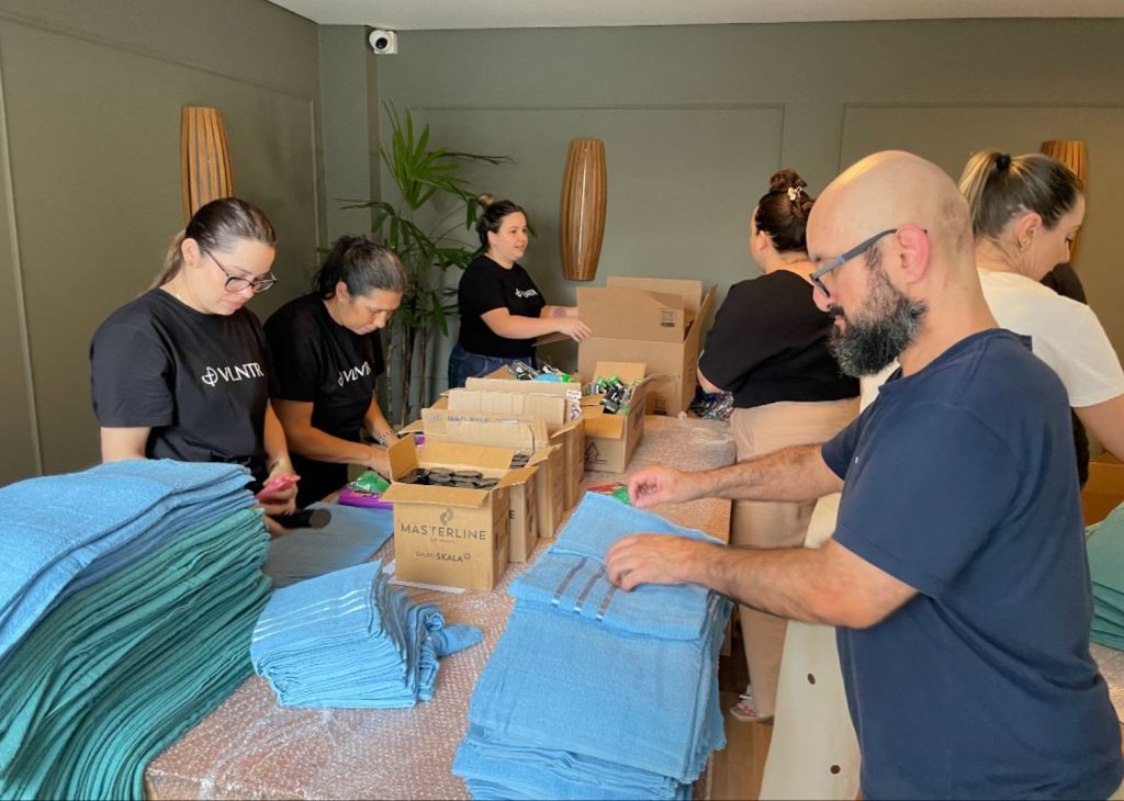 Os kits foram divididos em três categorias: femininos, masculinos e infantis, e montados graças a doações recebidas e ao trabalho de voluntários que se deslocaram até a sede da associação, em Joinville (SC), para ajudar na preparação dos materiais.